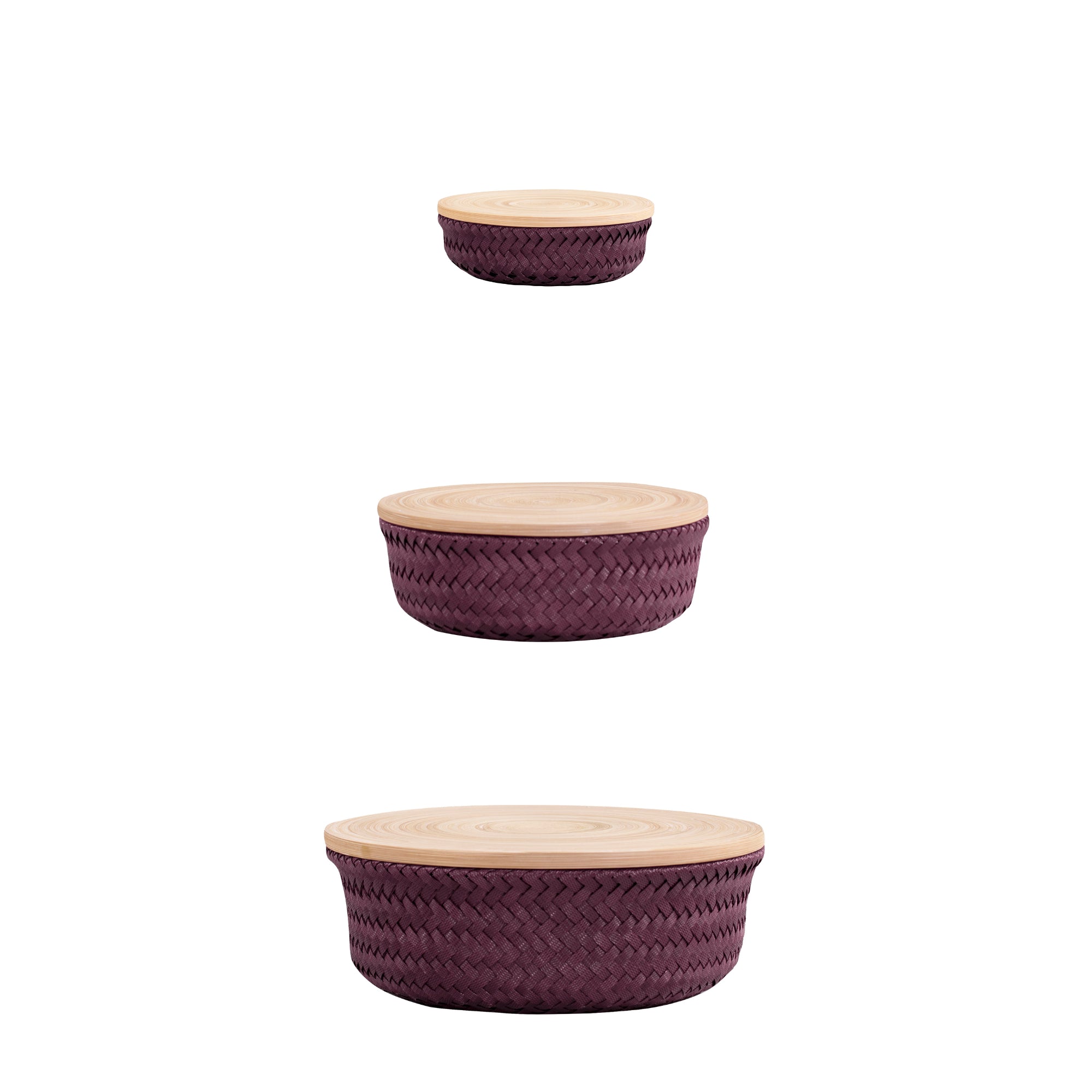 The Handed By Wonder collection consists of small, trendy baskets with a lid. Perfect for storing keys and cards in the hallway, for example. They are also wonderful for keeping jewelry, cotton pads, or make-up in your bathroom. The bamboo lid will keep your things neatly out of sight. This set consists of 3 round baskets with bamboo lid (Wonder XS - h7 x 17 x 17 cm), Wonder S (h8 x 21 x 21 cm), Wonder M (h11 x 26 x 26 cm).