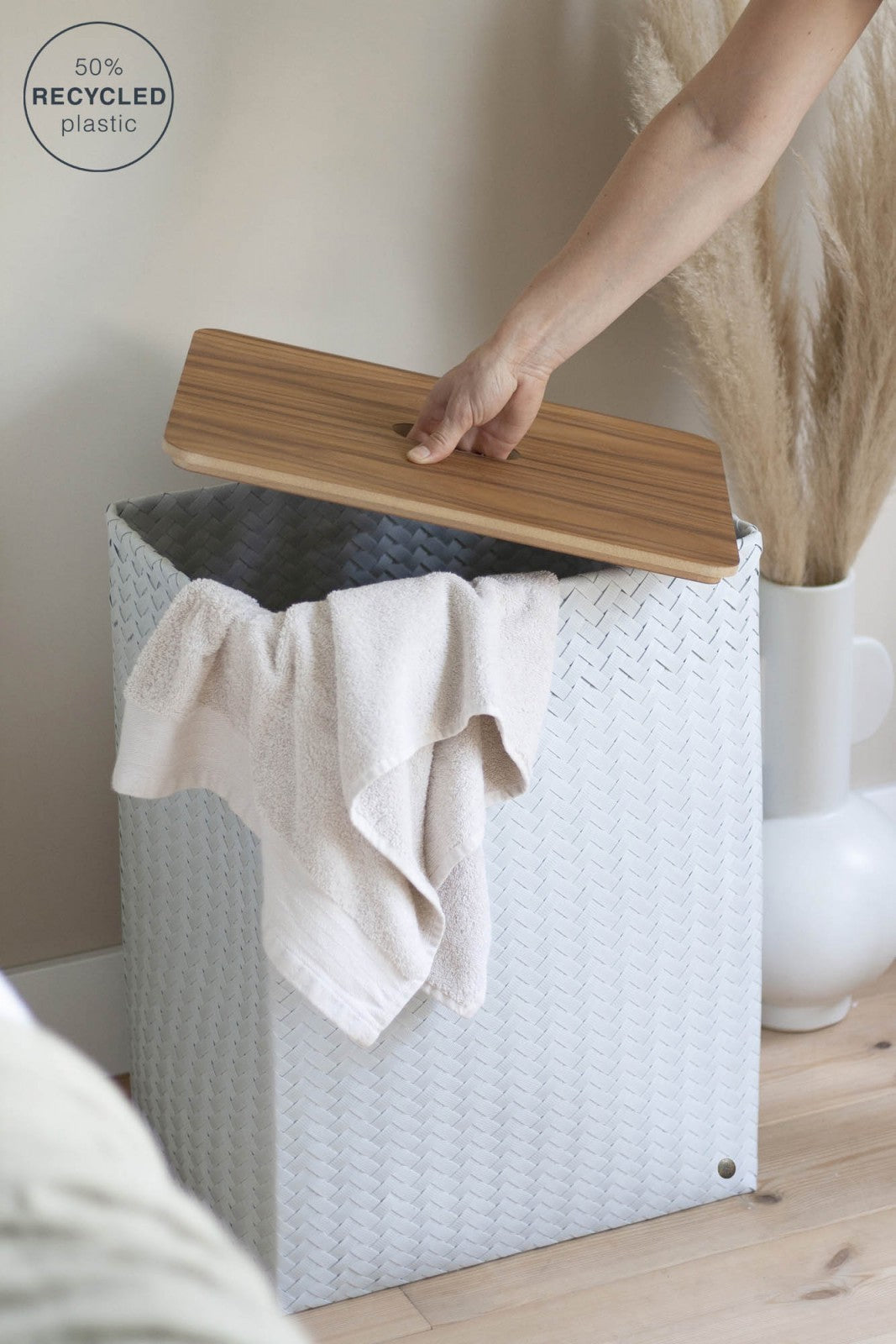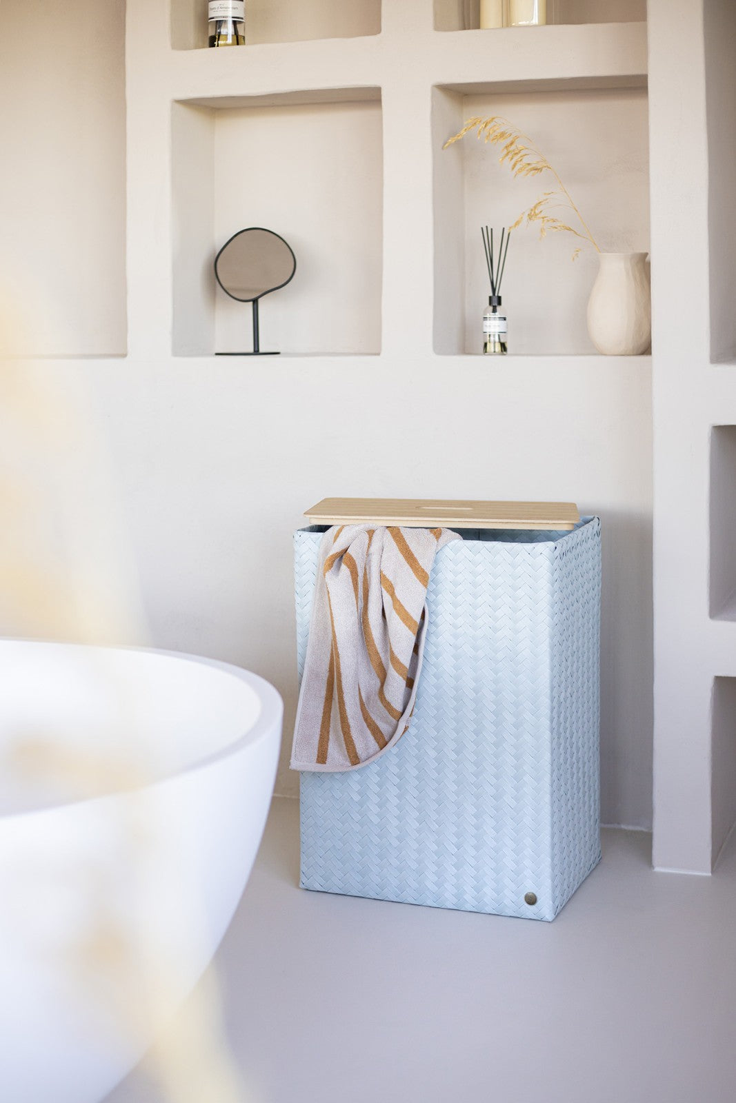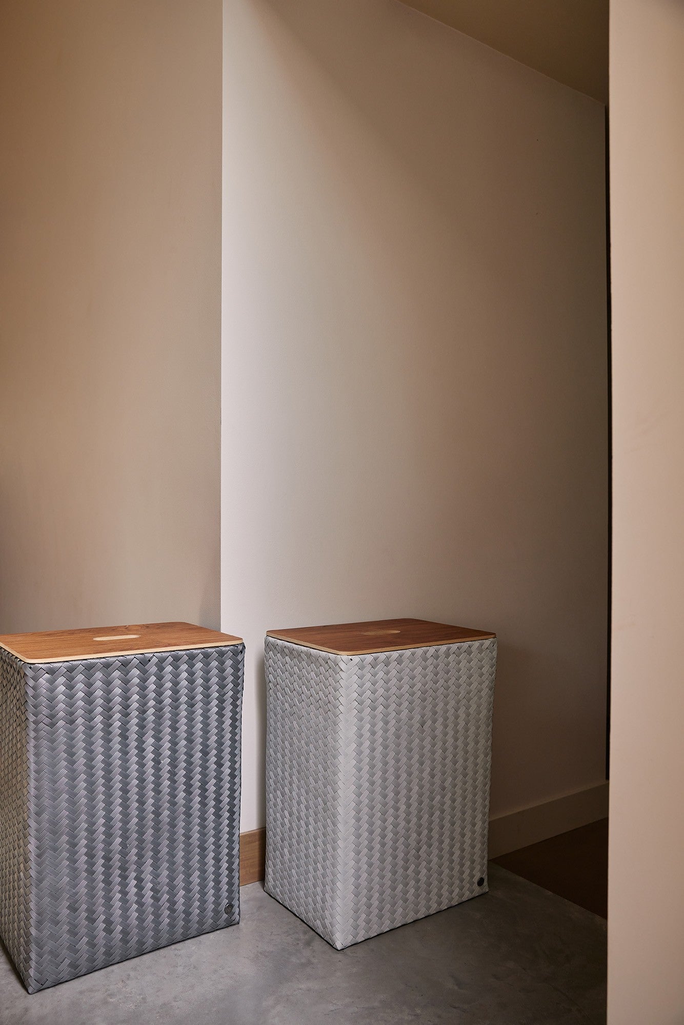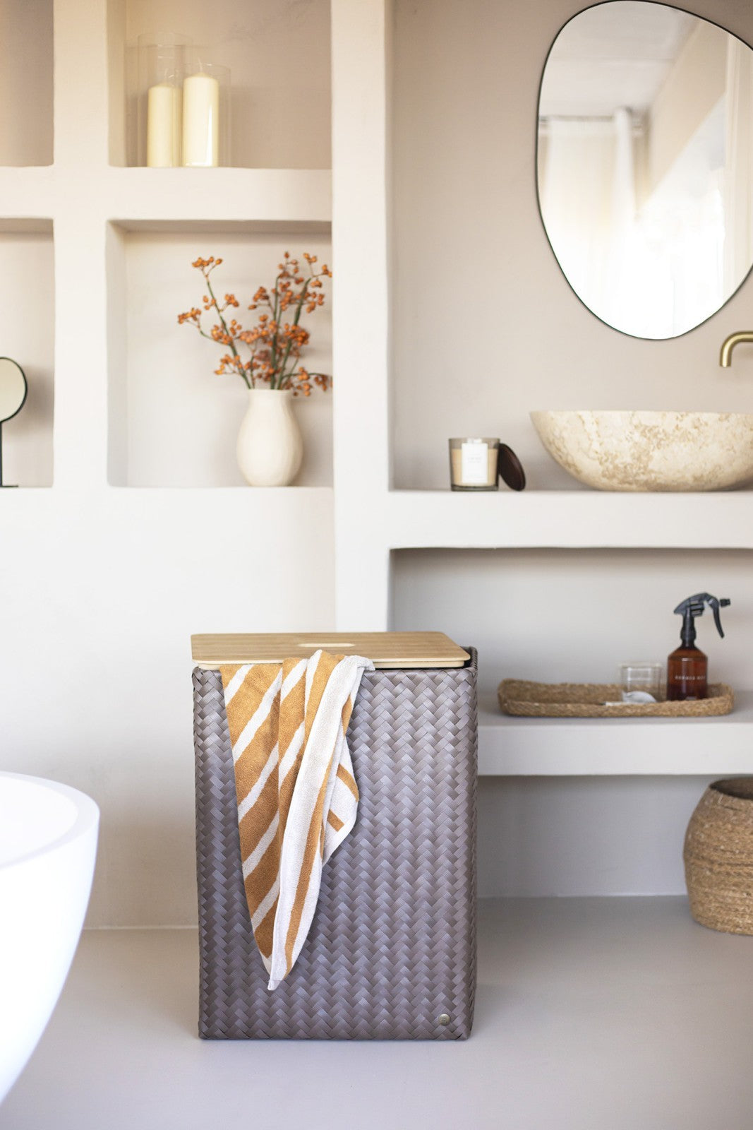 The biggest basket of the Grand collection from Handed By, the 'Grand superb'. A stylish laundry basket with a wooden lid. Also great to use in your hallway, for umbrellas, gloves and scarves. With the wooden lid, everything can be stored neatly out of sight. Life hack: put two different colours next to each other, to separate your dark laundry from your white laundry! The whole collection is hand-woven and made with recycled plastic.