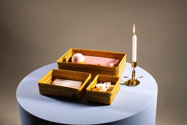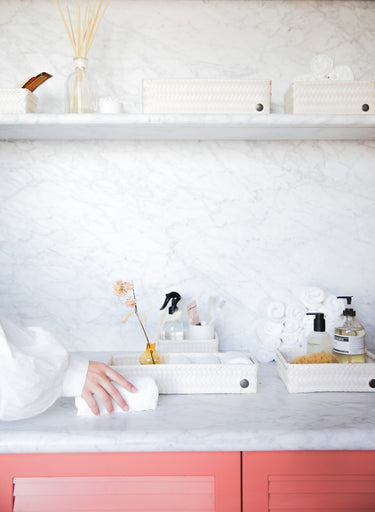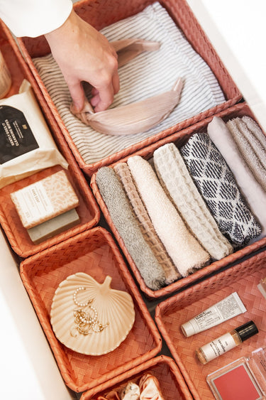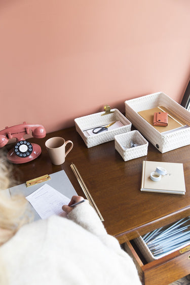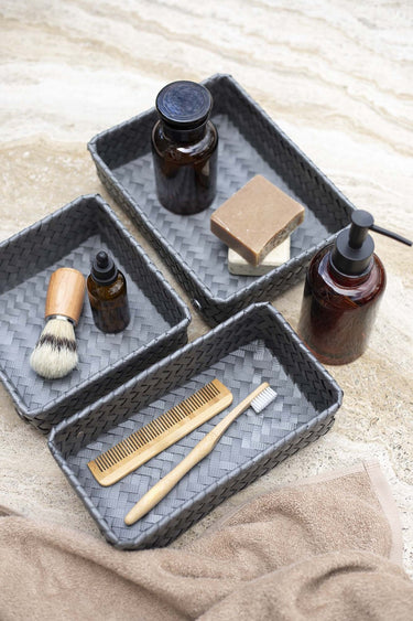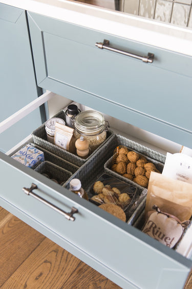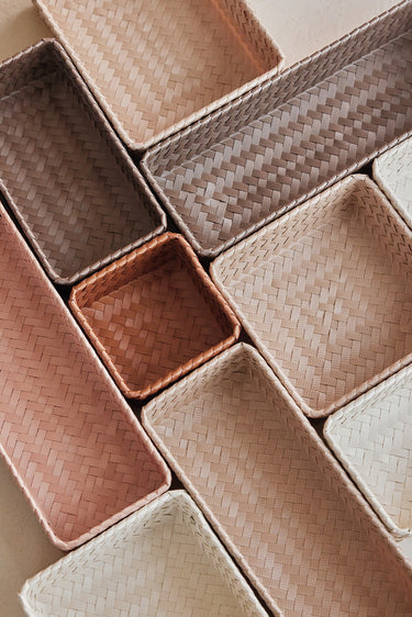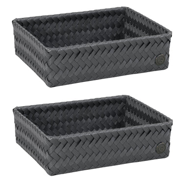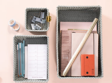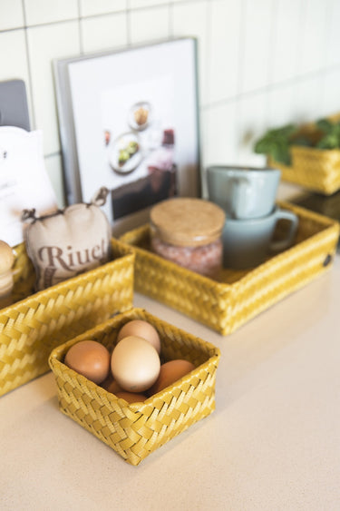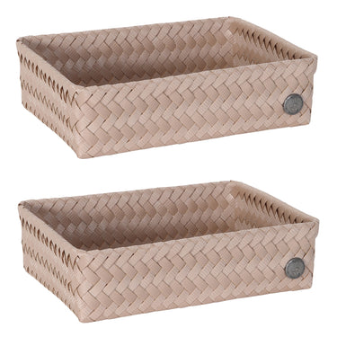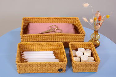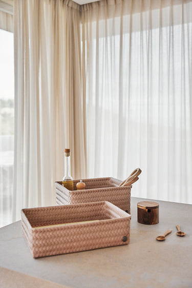 Le panier de rangement FIT medium peut être utilisé pratiquement partout. Pour les bouteilles d’huile d'olive et le savon sur le comptoir ou comme rangement des stylos et des crayons sur votre bureau par exemple. C'est également très beau de le remplir avec des serviettes roulées pour les invités dans les toilettes. Tressée à la main de matière plastique recyclée. Vous cherchez le même panier, mais un rien plus haut ? Alors, jetez un œil sur le FIT medium high! MINIMUM = 2 PIÈCES.