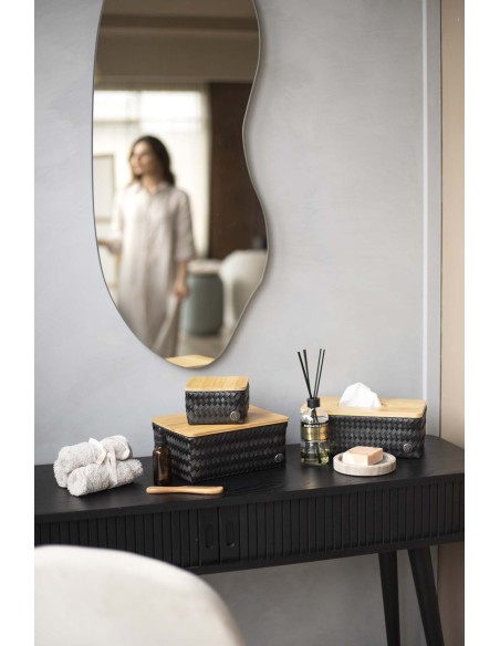 De opbergmand TOP FIT medium high zorgt ervoor dat rommel in huis verleden tijd is. De mand is fijn in gebruik, stijlvol en heeft een bamboe deksel. Handig om pennen, tekenspullen, bestek of andere losliggende spullen in de keuken bij elkaar te houden. Deze formaat mand is onmisbaar in een opgeruimd huis! Gooi er je sleutels in of bewaar hier je cadeaubonnen. Met de hand gevlochten en gemaakt van gerecycled plastic.