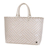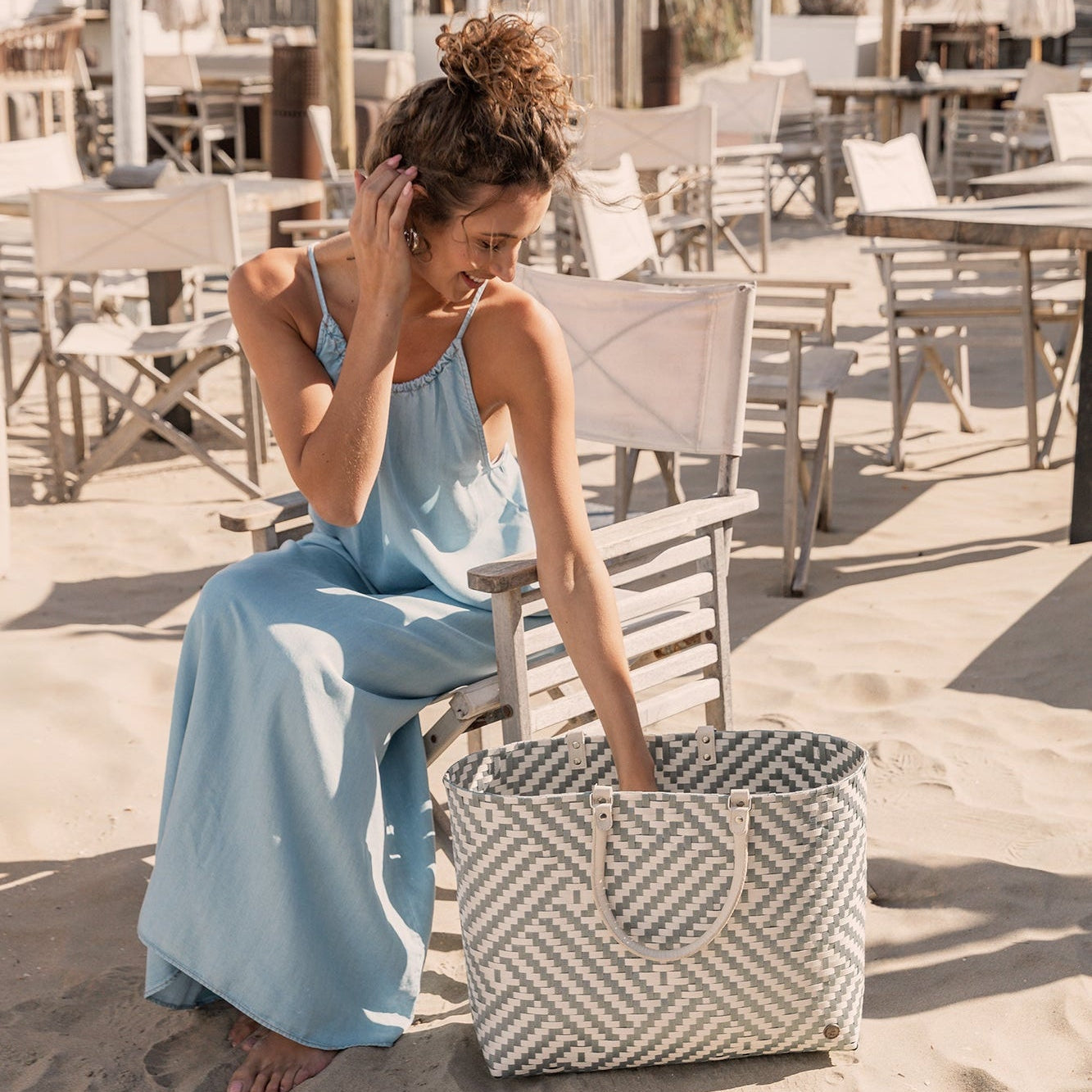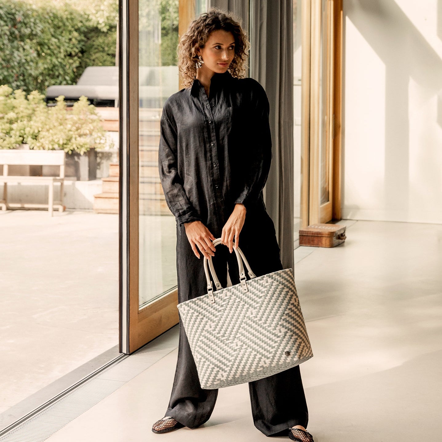 Ontdek ‘CLAIRE’, een wat grotere handtas met een klassieke uitstraling. Het uitvergrote vlechtpatroon geeft deze tas een speels diepte-effect. CLAIRE is een echte allrounder: groot genoeg voor al je spullen, of je nu naar het strand of de supermarkt gaat. Vrouwelijk, ruim en elegant. Met de hand gevlochten van gerecycled plastic.